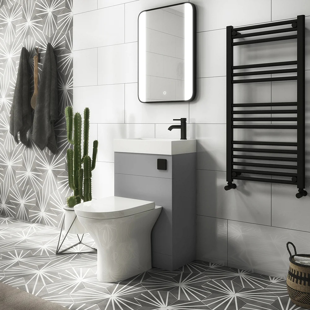 Short of space in your bathroom? the Arezzo Matt Grey Two-In-One Wash Basin and Toilet offers a stylish solution. This innovative design consists of a toilet with a sink on top – all pipework is neatly concealed inside a sleek matt grey unit with a matt black flush for a streamlined look. The built-in sink offers ample room for your chosen tap, while a practical soft close toilet seat shuts almost silently with a simple touch.