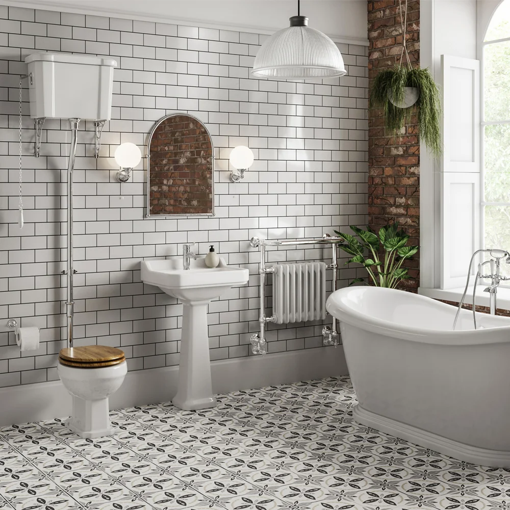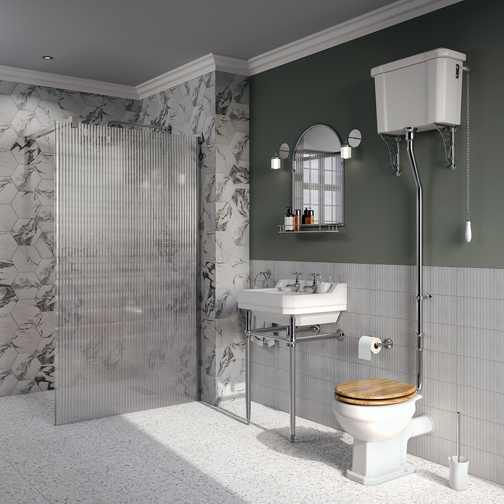 The Carlton High Level Toilet is a timeless classic in bathroom design. It features a ceramic handle flush, complemented by an exposed polished chrome connecting pipe. With its high-level style that extends 625mm from the wall, this piece imparts a distinct period look to your bathroom, particularly when paired with matching items from the Carlton collection.