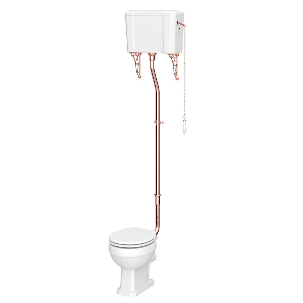 A high-quality traditional rose gold high level toilet with seat. The Chatsworth traditional high level toilet with it’s classic styling has been designed to match the Chatsworth range of bathroom furniture. Features quick release hinges for easy cleaning. Manufactured using high-grade vitreous china ensuring a quality finish and long lasting durability. Supplied with a stunning rose gold flush pipe pack which includes – decorative brackets, flush pipes and hand flush.