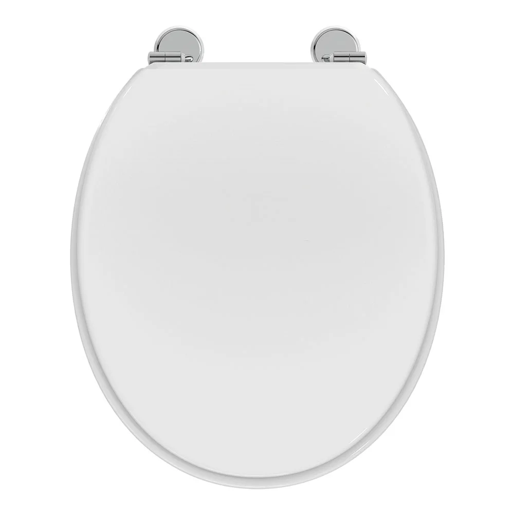 A traditional style toilet seat designed for use with Ideal Standard Waverley toilet pans. Featuring normal close chrome plated hinges, this practical and durable seat can withstand everyday use.